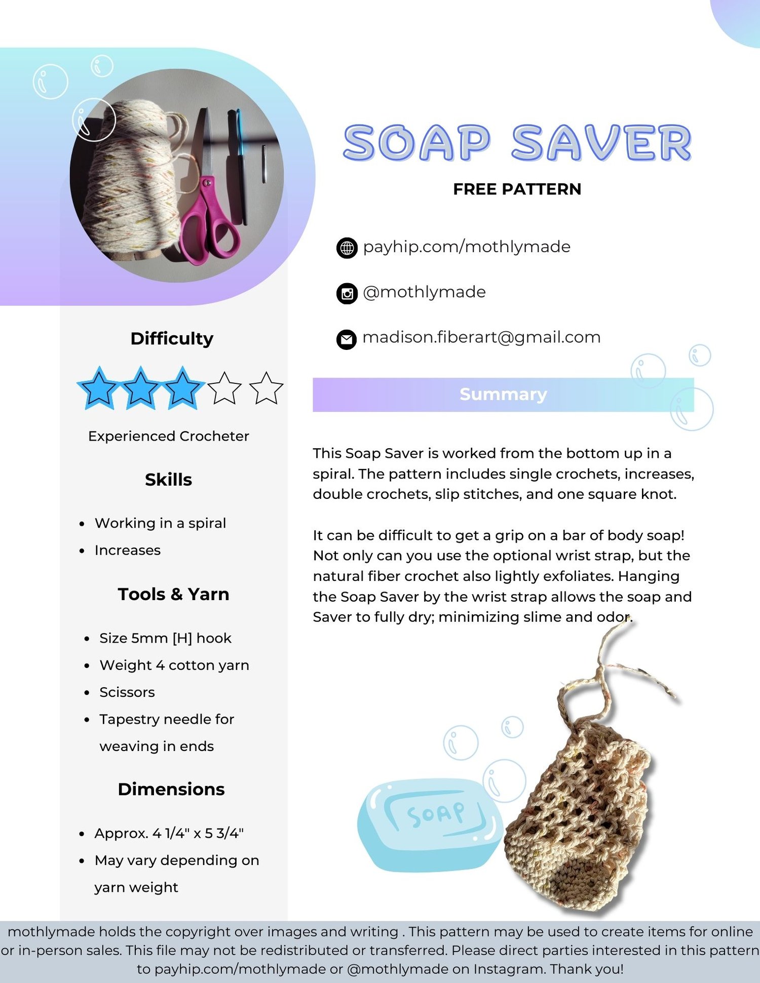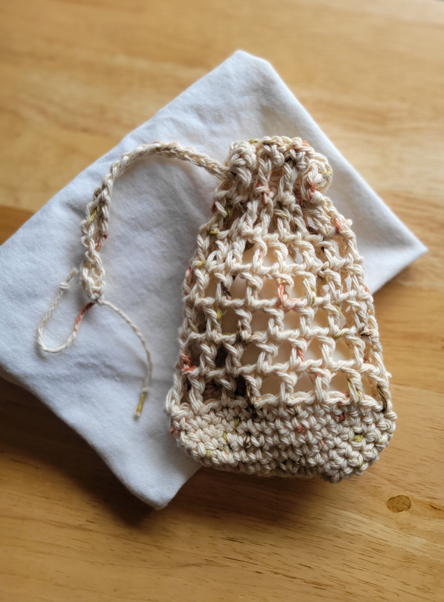 This Soap Saver is worked from the bottom up in a spiral. The pattern includes single crochets, increases, double crochets, slip stitches, and one square knot.