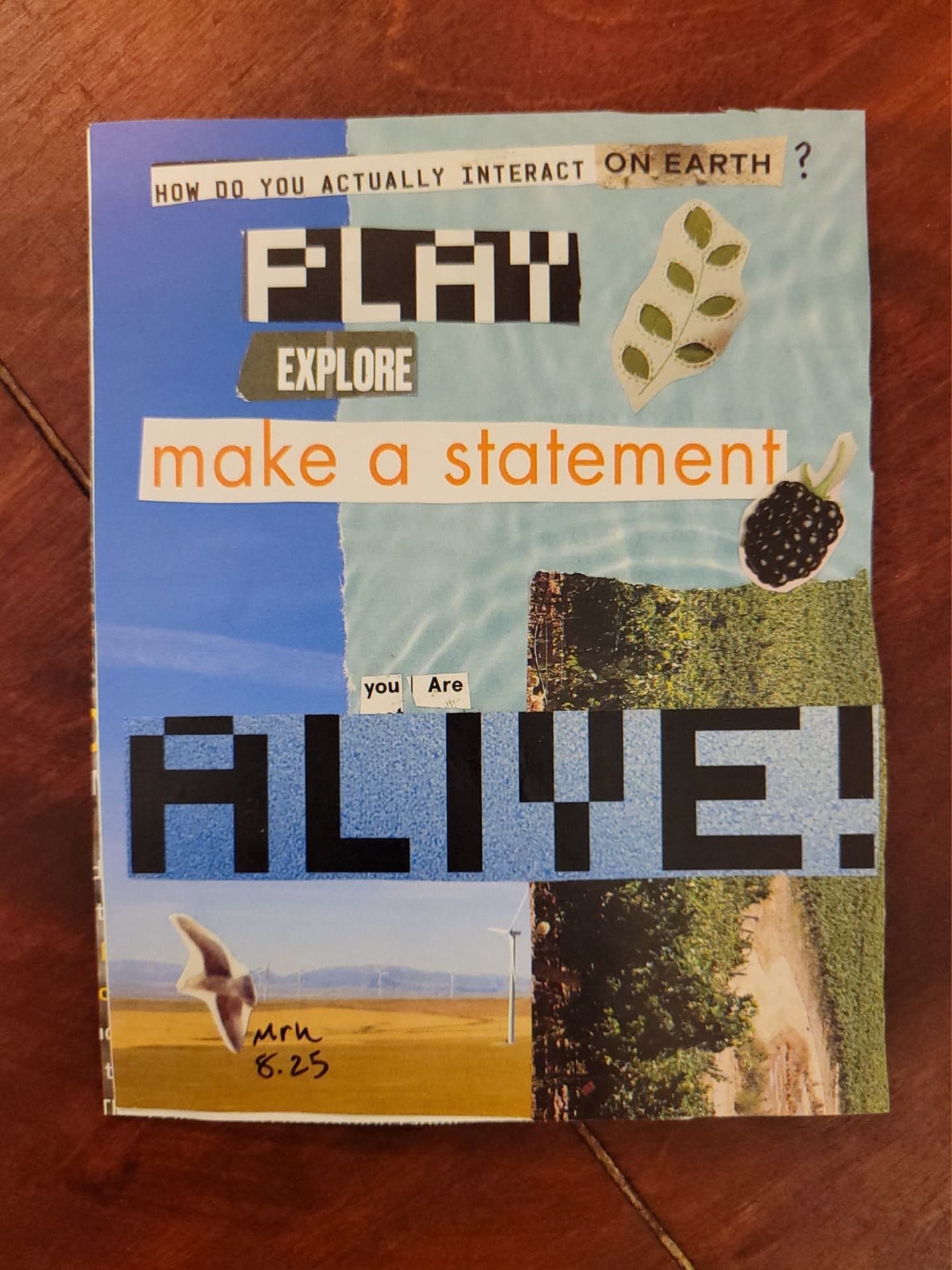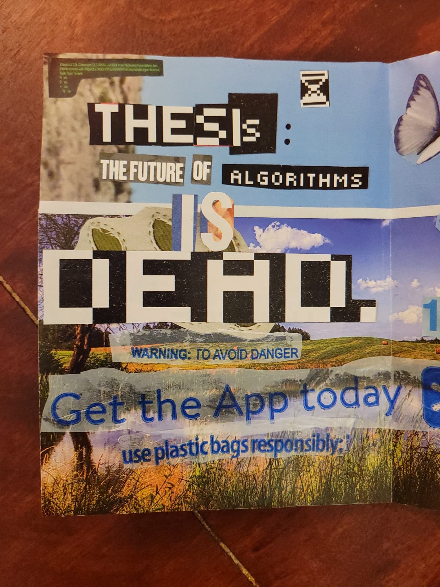 TODAY'S FORECAST: THE END OF THE WORLD is 4-page zine made in August 2025. The robotic text is juxtaposed with a natural, optimistic backdrop, ending with a plea to make something of your life.